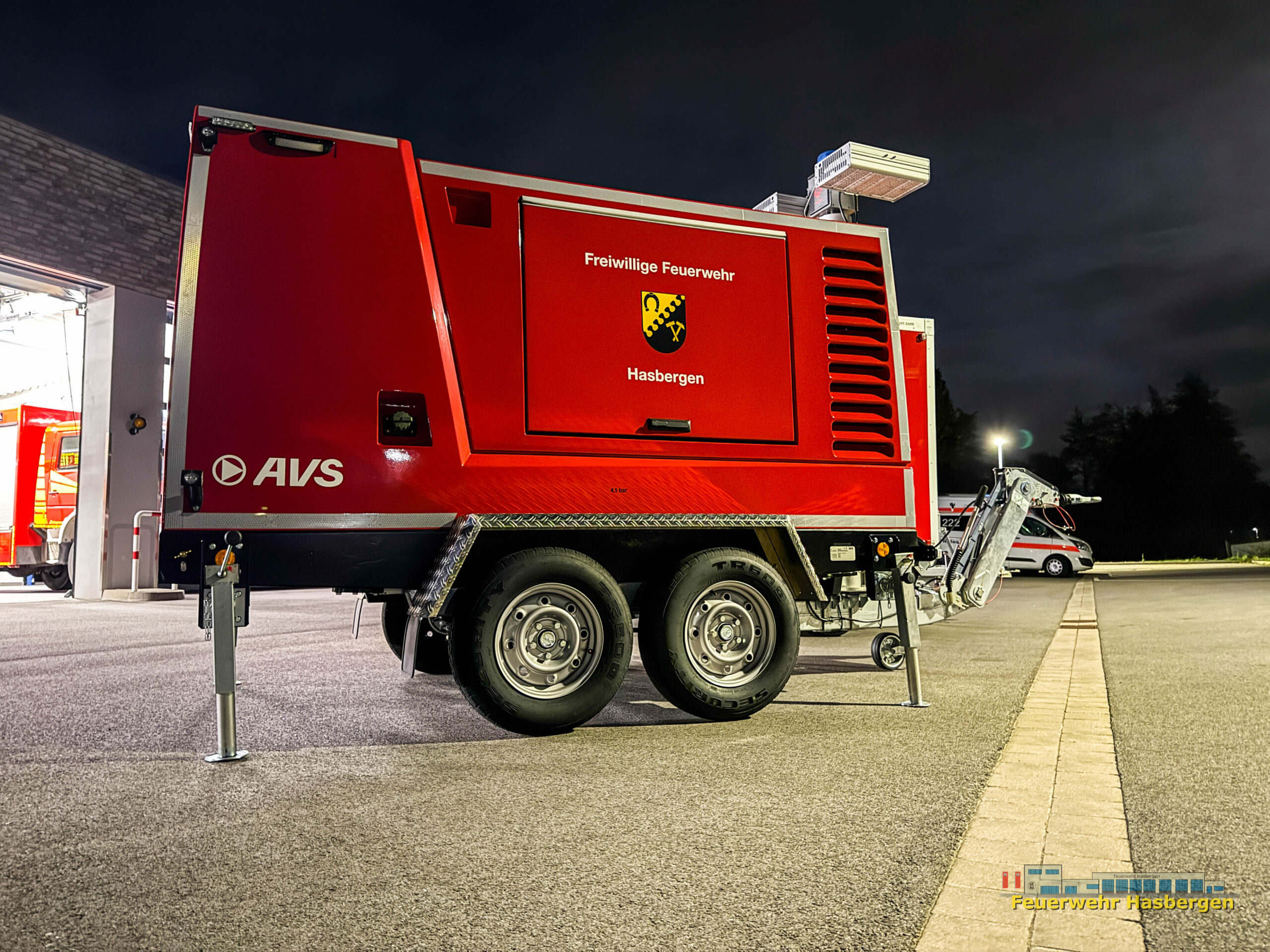 Hierbei handelt es sich um einen Notstromanhänger, der von der Firma AVS Aggregatebau gefertigt wurde und über eine Leistung von 100 kVA verfügt. Im Falle eines Stromausfalls kann er das Feuerwehrhaus Hasbergen vollständig mit Energie versorgen. Dies ist notwendig, um das Gebäude im Einsatzfall als Abschnittsführungsstelle weiter nutzen zu können.