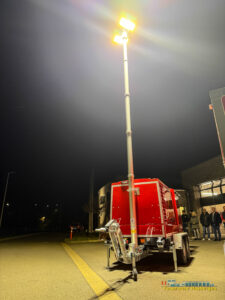 Der Anhänger rückt zusammen mit dem GW-L2 aus. Er ist mit speziellen Einspeise- und Verlängerungskabeln und Verteilern ausgestattet und verfügt über einen großen Lichtmast (Höhe = 6,8 Meter) mit 2x 390W LED Scheinwerfern (67.500 Lumen). Dadurch kann er nicht nur das Feuerwehrhaus mit Strom versorgen, sondern auch größere Einsatzstellen – insbesondere bei Nacht – ausleuchten und diese mit Energie versorgen.