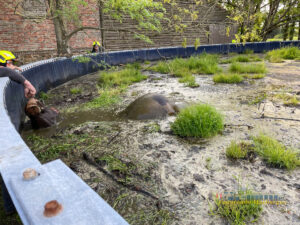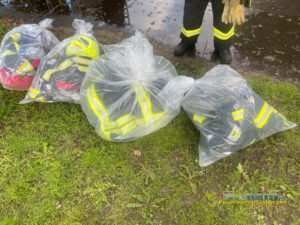 Nachdem der Bulle befreit worden war, mussten das eingesetzte Material, die Gerätschaften und die Einsatzkleidung gründlich gereinigt werden. Hier zeigt sich, dass die Anschaffung eines Hygienecontainer für den Gerätewagen Logistik und der Besitz einer Industriewaschmaschine und eines Trockners von hohem Nutzen für die Feuerwehr sind.
