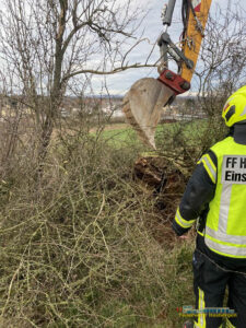 Somit rückte die Feuerwehr Hasbergen an, um mit Hilfe von Schaufeln und einem Bagger einen sicheren Zugang zu dem Vierbeiner zu schaffen.